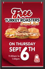 Print this coupon and get a free Arby’s Hot Turkey Roasters Sandwich on September 6th!