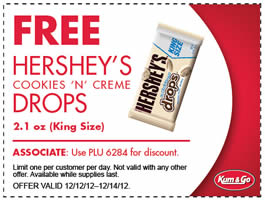 Print out this coupon and get free Hershey’s Cookies ‘N Creme Drops King Size Bar at Kum & Go: