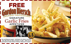 Print this coupon and bring it to your local Gordon Biersch Restaurant and get free Garlic Fries expires on January 22, 2013.: