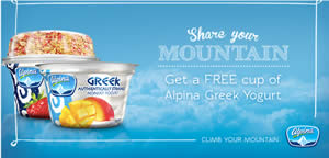 Fill out their Facebook form to get free Alpina Greek Yogurt or Yogurt with Artisan Granola: