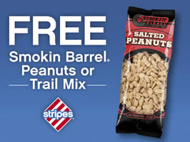 Print and redeem this coupon to get free Smokin Barrel Peanuts or Trail Mix at Stripes Stores Valid until May 9-10 live near a Stripes convenience store in Texas, Oklahoma, or New Mexico